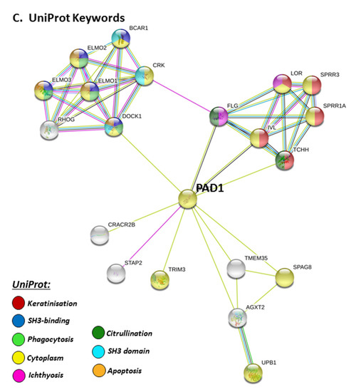 STRING pathways for PAD1 revealed a range of immunological GO pathways, including phagocytosis, VEGF signalling, immune effector processing and programmed cell death (Figure 5A), while the KEGG pathway relates to infection and associated immune responses (Figure 5B). Roles in skin related responses, as well as immune responses, were further confirmed with UniProt keywords, which included skin diseases, phagocytosis, citrullination/deimination and apoptosis (Figure 5C).