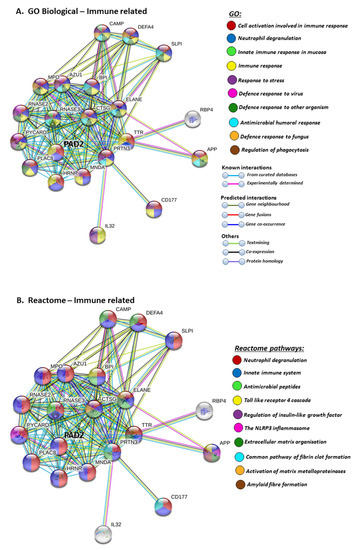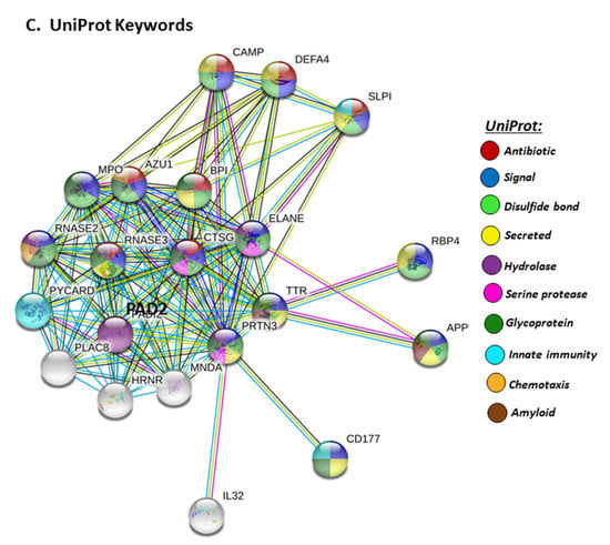 Furthermore, PAD2 protein interaction networks indicate a strong role in immune responses, including innate immunity, mucosal immunity, response to stress, anti-microbial, antifungal responses and, in particular, defence responses to viruses. Regulation of phagocytosis and neutrophil degranulation are also linked to PAD2 and its protein interaction partners (Figure 6A). The reactome pathways for the PAD2 protein networks also verified a strong immune regulatory role (Figure 6B), and this correlated with identified UniProt keywords (Figure 6C).