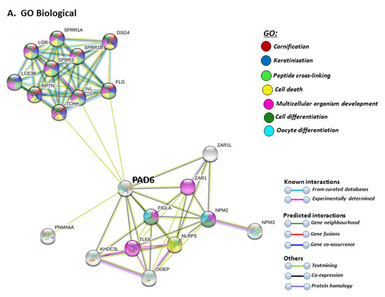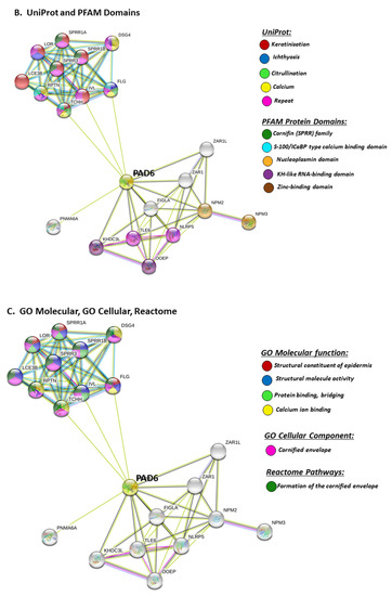 STRING analysis for PAD6 confirmed its known function in developmental and pre-implantation processes, but the GO pathways also highlight dual processes in skin physiology as well as immunity, involving cell differentiation and cell death (Figure 9A). UniProt keywords relate to calcium processes and skin physiology, while PFAM domains relate to similar functions, including calcium- and zinc-mediated processes (Figure 9B). GO pathways for molecular function highlight epidermal, structural and calcium binding pathways (Figure 9C), and cornification is further supported by GO Cellular component pathways and reactome pathways (Figure 9C). The link to keratinization/cornification and skin is unexpected, as PAD6 is not known to be expressed in the epidermis, and this link is only established via text mining (lime green line) linking PAD6 with Filaggrin (FLG), Involucrin (IVL) and Trichohyalin (TCHH) (Figure 9).