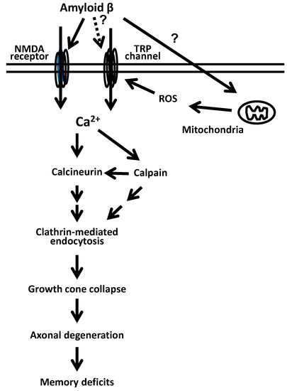 Aβ induces neuritic degeneration in in vitro models, in vivo mouse models, and AD patients, leading to disruption of neuronal networks and memory deficits [17,21,23,24,25,26,27,28]. Although several studies have suggested a variety of mechanisms of Aβ-induced neuritic degeneration, such as abnormality of autophagy and activation of calcineurin [29,30], its critical cause has not been identified. We observed Aβ-induced acute collapse of axonal growth cone within 1 h in cultured neurons [20,31]. This culture system made it possible to visualize and analyze early events in the Aβ-induced axonal degeneration process. Various inhibitors and mutated gene transfection revealed that Aβ induced Ca2+ signaling via N-methyl-D-aspartate receptor and transient receptor potential channel, activated calcineurin and calpain, facilitated clathrin-mediated endocytosis, and induced growth cone collapse (Figure 1). In case of repulsive axon guidance, asymmetric clathrin-mediated endocytosis removes the plasma membrane and β1-integrin from the surface of the growth cone, leading to turning the growth cone away from the reduced membrane [32]. Therefore, Aβ might remove some functional molecules from the surface of the growth cone, leading to the collapse of the growth cone and then causing atrophy of axons.