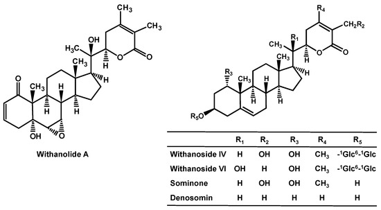- Kuboyama, T.; Tohda, C.; Komatsu, K. Withanoside IV and its active metabolite, sominone, attenuate A beta(25-35)-induced neurodegeneration. Eur. J. Neurosci. 2006, 23, 1417–1426. [Google Scholar] [CrossRef] [PubMed]