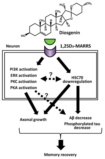 In normal cultured neurons, diosgenin induced axonal growth [73]. In normal young mice, diosgenin increased axonal density in the brain cortex and enhanced memory. These in vitro and in vivo effects of diosgenin were completely blocked by the functional blocking antibody for 1,25D3-MARRS. These results indicate that 1,25D3-MARRS is a receptor for diosgenin with positive effects on axons and memory in AD-like conditions as well as in normal conditions.