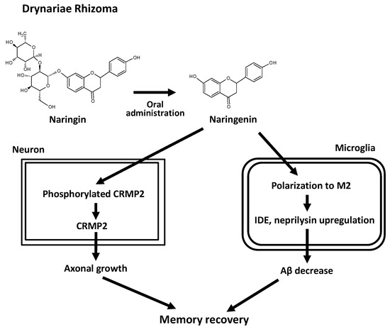 Drynariae Rhizoma (DR) is a rhizome of Drynaria fortunei (Kunze ex Mett.) J. Sm. (Polypodiaceae), which is a Chinese herbal drug used for bone fracture and for tonifying the kidneys [78]. We found that water extract of DR induced axonal growth in the Aβ-treated neuron culture [79]. Oral administration of DR extract attenuated degenerated axons and improved memory in 5XFAD mice [80]. In vitro bioassay-guided isolation is usually performed to identify the active compounds in herbal medicines [81]. However, this method may sometimes lead to the misidentification of the real active compounds, as the metabolization process in the body and permeability of the blood-brain barrier are ignored. Therefore, we aimed to identify the real active compounds by detecting compounds in the brain of 5XFAD mice after oral administration of DR extract (in vivo screening) [80]. Naringenin was identified as a compound that crossed the blood-brain barrier. Naringenin showed axonal growth activity in the Aβ-treated neuron culture, ameliorated degenerated axons, and improved memory in 5XFAD mice. The DR extract contained a low amount of Naringenin itself. However, it contained an abundant amount of naringin, a glycoside of naringenin [80]. After oral administration of the DR extract, naringin is metabolized into naringenin and absorbed [82], and then likely transferred into the brain. The DARTS method showed that collapsin response mediator protein 2 (CRMP2) is a candidate of direct binding protein with naringenin. After treatment with naringenin to cultured neurons, the neuron lysate was immunoprecipitated with an anti-CRMP2 antibody. As a result, naringenin was detected from the immunoprecipitation. These results mean that naringenin directly binds to CRMP2. Knocking down of CRMP2 diminished axonal growth activity of naringenin. In Alzheimer’s disease, Aβ induced CRMP2 phosphorylation and axonal degeneration [83,84,85]. Our culture experiments also showed that Aβ increased phosphorylated CRMP2, while naringenin decreased it. These results indicate that naringin in the DR extract is metabolized into naringenin after oral administration of DR. Subsequently, naringenin is transferred into the brain. It binds to CRMP2, dephosphorylates CRMP2, ameliorates degenerated axons, and recovers memory (Figure 4).