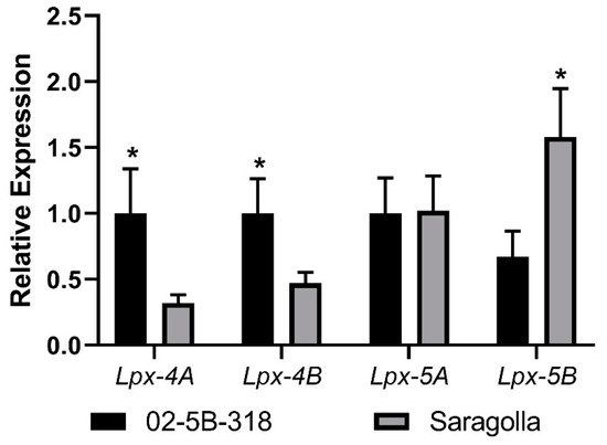 Lipoxygenase (Lpx) gene expression on leaves. qPCR was performed on the Lpx genes mapped on chromosomes 4A, 4B, 5A, and 5B in leaves of the bread wheat accession “02-5B-318” (low YI) and the durum wheat cv. “Saragolla” (high YI). ANOVA and Fisher’s least significant difference (LSD) tests were used to underline significant differences between the genotypes, * p < 0.05.