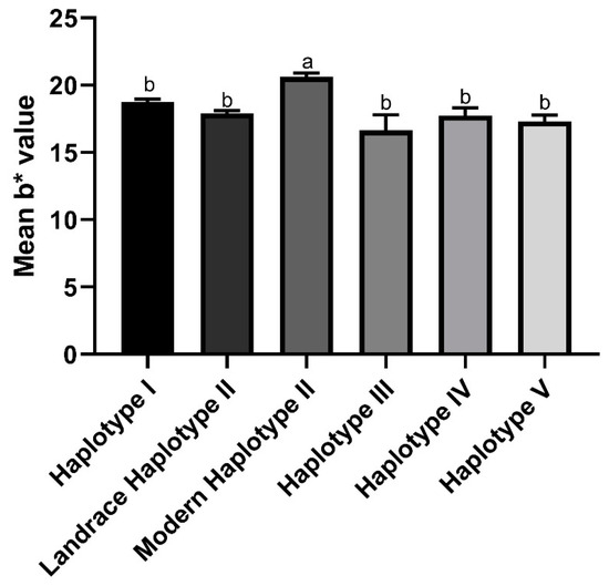 Large variability was identified in haplotypes I and II, with b* values ranging from 12.38 to 25.78, and 10.32 to 23.49, respectively. These haplotypes were the most frequent within the Mediterranean panel (Table 6). The results of the ANOVA and the comparison of the mean b* values of the five haplotypes showed no statistical differences among them (Table 6). Interestingly, all modern genotypes harbored haplotype II (Table 3). When the genotypes carrying haplotype II were segregated in “haplotype II landraces” and “haplotype II modern cultivars”, significant differences appeared between them, as the latter encompassed the cultivars with higher levels of yellowness (Figure 2).