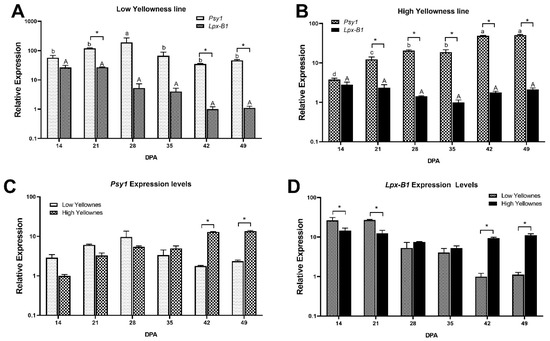 Relative expression of Psy1 and Lpx-B1 genes during the grain filling stage in high and low yellowness Mediterranean genotypes. (A), relative expression in a low yellowness genotype during grain filling. (B), relative expression in a high yellowness genotype during grain filling. (C), comparison of the relative expression of Psy1 between high and low yellowness genotypes during grain filling. (D), comparison of the relative expression of Lpx-B1 in high and low yellowness genotypes. Two-way ANOVA and Tukey’s post hoc test were performed (p < 0.05). Upper and lower case are used to compare DPAs for each gene or genotype, an asterisk is used to denote statistical significance between conditions at each DPA. DPA, days post anthesis. All bars represent the mean of three biological and technical replicates (n = 9).