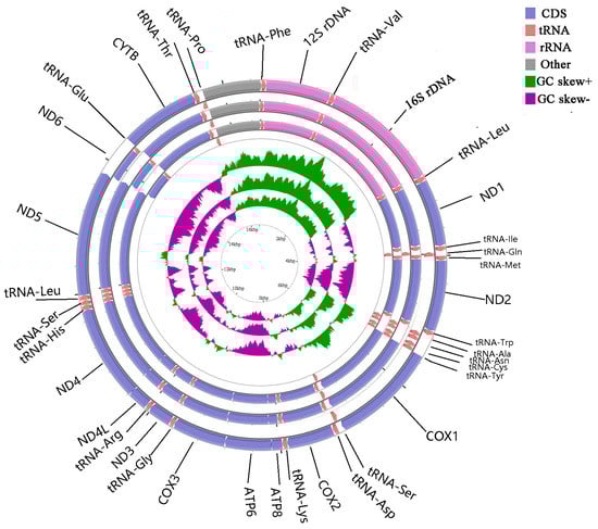- Boore, J.L. Animal mitochondrial genomes. Nucleic Acids Res. 1999, 27, 1767–1780. [Google Scholar] [CrossRef] [PubMed]