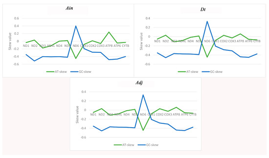 Graphical illustration showing the AT- and GC-skew in the protein-coding genes (PCGs) of the mitochondrial genome of Alectis indicus (Ain), Decapterus tabl (Dt), and Alepes djedaba (Adj).