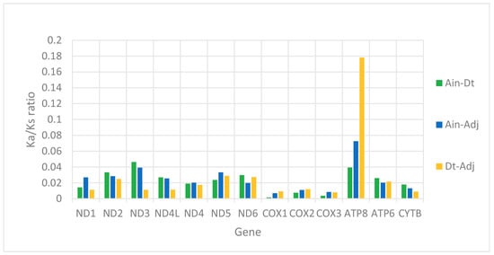 Evolutionary rates of the mitogenomes of Alectis indicus (Ain), Decapterus tabl (Dt), and Alepes djedaba (Adj). Note: The ratio of non-synonymous substitutions to synonymous substitutions (Ka/Ks) for each PCG is indicated.