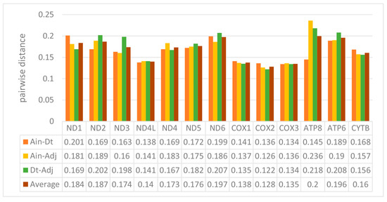 Overall mean p-genetic distances between Alectis indicus (Ain), Decapterus tabl (Dt), and Alepes djedaba (Adj) for each of the 13 PCGs. Note: Values were calculated using the first and second nucleotide positions, the entire codon, and over the full sequence.