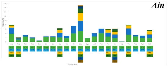 Serine and leucine were encoded by six codons each, while the other amino acids were encoded by four or two codons (Figure 5). Codon frequency referred to the frequency of codon occurrence in all PCGs. Leu (CUC, CUA), Phe (UUC), Ile (AUC), and Ala (GCC) were the most frequent codons, while termination codons (UAG) and Cys (UGU) were the least frequent (Figure 5). The relative synonymous codon usage (RSCU) refers to the relative probability that a particular codon was encoded in a synonymous codon of the corresponding amino acid. Arg (CGA), Lys (AAA), Gln (CAA), and Ser (TCC) were the most frequent, while Ser (AGT, TCG), Thr (ACG), Leu (TTG), Ala (GCG), and Pro (CCG) were rare in the RSCU analysis (Figure 5). The chain asymmetry caused by the difference in base composition could also affect codon usage. C and A bases were more frequent in the third positions of codons than were U and G bases (Table S2), which showed that the codons NNA and NNC were a minority, whereas the synonymous codons NNU and NNG were the majority.