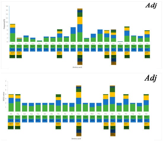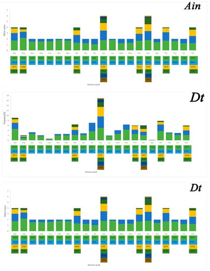 Codon frequency and RSCU (relative synonymous codon usage) in the mitochondrial genomes of Alectis indicus (Ain), Decapterus tabl (Dt), and Alepes djedaba (Adj).