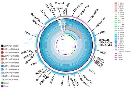In incremental order, the average base compositions of the three complete mitogenomes were 16.64% G, 25.67% T, 27.74% A, and 29.94% C (Table S1), showing that the C and A content was much higher than the G and T content. This phenomenon has also been found in other species of the family Carangidae, all of which have negative AT-skew and positive GC-skew values (Table S1), showing significant chain-specific or chain asymmetry bias. The mechanism underlying chain bias was often interpreted as evidence of asymmetrical directional mutation stress [20]. The genes with the highest average GC content were identified in tRNA-Thr (52.78–58.33%) and tRNA-Ser (50.75–57.35%) (Table 1).