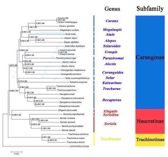 Phylogenetic tree inferred from the amino acid sequences of 13 PCGs of 32 species of Carangidae. Larimichthys crocea was used as the outgroup. The numbers at the nodes are the bootstrap support values (left) and Bayesian posterior probabilities (right).