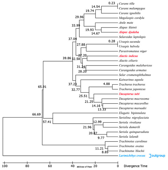 Chronogram for the 32 species of Carangidae with a single outgroup Larimichthys crocea based on the Bayesian topology calculated from analysis of the 13 PCGs. Divergence times were estimated using three calibrations. The red fonts represent the three species sequenced in this study, and the blue fonts represent the outgroup species.