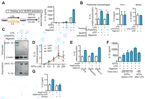Nucleotides increase LPS-primed IL-1β production. (A) Schematic representation of the protocol employed to activate the NLRP3 inflammasome (left). Representative analysis of IL-1β produced by peritoneal macrophages (RPM) plated in duplicates at 0.3 × 106 cell/mL and primed with LPS, in the absence (white) or presence (blue) of 100 μM ATP and UTP (NTPs) for 3h and then the NLRP3 inflammasome was activated with nigericin; bars indicate +SD. (B) IL-1β production from RPMs, mouse bone marrow derived macrophages (BMDM) or THP-1 cells primed with LPS in the absence (white bars) or presence (blue bars) of nucleotides when NLRP3 was activated with ATP or nigericin as indicated; average +SEM of 12 and eight experiments, respectively, is shown for RPMs, one representative experiment out of n = 3 different experiments for BMDM and n = 2 for THP-1. (C) Representative analysis by Western blot of cell lysate and supernatants of macrophages primed with LPS only (left and right lanes) or LPS with NTPs (middle lane) and then activated with nigericin as indicated. (D) Dose-response effect of nucleotides priming with LPS on IL-1β production as indicated in (A); data is normalized to IL-1β production of RPMs primed with LPS absence of nucleotides and shows the average of three experiments +SEM. (E) IL-1β production in supernatants from RPMs primed with the indicated PAMP in the presence (blue bars) or absence (white bars) of NTPs (20 μM UTP/ATP) for 3 h and following NLRP3 activation with nigericin. One experiment +SD out of three is shown. (F) Kinetic analysis on IL-1β production when NTPs were added prior (negative values) at the same time or after (positive values) cells were primed with LPS and after 3 h NLRP3 was activated with nigericin; a representative experiment out of 2–4 is shown, bars indicate +SD. (G) Resting RPMs were primed with NTPs (20 μM UTP/ATP) or not for 10 min. before adding LPS, then cells rinsed (right pair of columns) or not (left pair of columns). LPS was then added for 3h and NLPR3 inflammasome was activated using 3 mM of ATP for 24 min. Supernatants from both conditions were compared for IL-1β production. A representative experiment of three is shown with SD. * = p < 0.05 or ** = p < 0.01 significance.