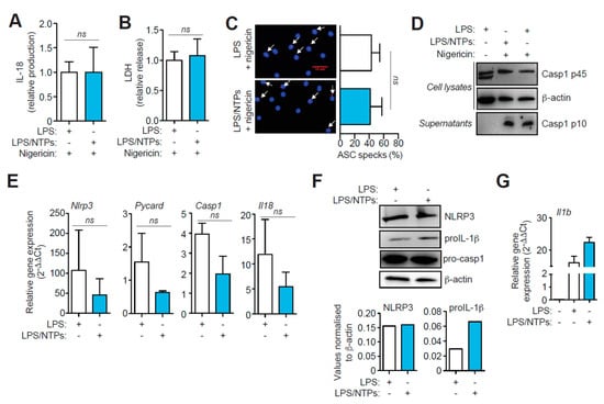 We then found that NTPs priming did not affect other outcomes of NLRP3 inflammasome activation, and the release of IL-18, pyroptosis (as measured by LDH release), or the percentage of ASC-specking macrophages, were not increased (Figure 2A–C). Furthermore, similar caspase-1 p10 subunit was detected on the supernatants of macrophages primed with NTPs (Figure 2D). Also, gene expression of inflammasome components Nlrp3, Pycard, Casp1 or Il18 was not increased when LPS priming was performed in the presence of NTPs (Figure 2E). NLRP3 protein expression was also not altered when NTPs were added during LPS priming (Figure 2F). However, pro-IL-1β protein increased in macrophages stimulated with LPS and NTPs (Figure 2F). This increase in IL-1β protein, was also confirmed at transcriptional level (Figure 2G), suggesting that the enhanced release of IL-1β after NLRP3 activation could be due to an increase in gene expression.