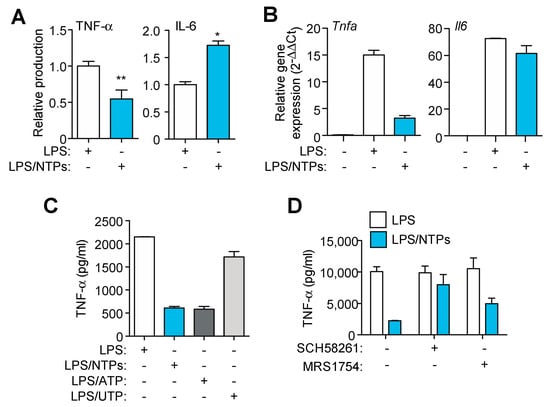 Nucleotides decrease TNF-α while increase IL-6 production. (A) ELISA for TNF-α and IL-6 in supernatants from peritoneal macrophages (RPMs) treated with LPS for 3 h in the presence (blue bars) or absence (white bars) of nucleotides (NTPs: 20 μM UTP/ATP) without activating the NLRP3 inflammasome. Normalized data shows average +SEM from eleven (TNF-α) and seven (IL-6) experiments. (B) qPCR analysis of TNF-α and IL-6 from RPMs treated as in (A); a representative experiment of three is shown +SD. (C) ELISA for TNF-α from cells treated as in (A), but combining nucleotides or separating them as indicated, one representative experiment out of three is shown +SD. (D) Supernatants from RPMs pretreated with the indicated inhibitors before being activated were analyzed for TNF-α; a representative experiment out of two is shown +SD. * = p < 0.05 or ** = p < 0.01 significance.