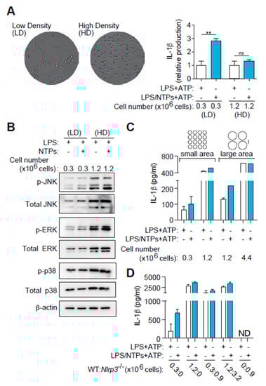 MAPK signaling is dependent on multiple factors, including stress and survival signals as well as intercellular contact. Since we did not observe any effect on macrophage viability during activation or inhibition of MAPK, we decided to study their signaling on different cell confluences. Macrophages seeded at high cellular concentration (>106/mL) resulted in low differences in IL-1β release between cells primed only with LPS or with LPS and nucleotides (Figure 6A). Only when cells were plated at lower concentration (<0.5 × 106/mL) the enhancing action of NTPs in IL-1β release was observed (Figure 6A).