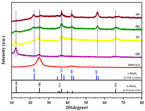 XRD was conducted to study the crystal structure of the samples. In Figure 1, XRD patterns of pristine δ-MnO2, MWCNTs and MN-CNTs having different ratios of MnO2 and MWCNTs are shown. MN-CNT6040, MN-CNT7525 and MN-CNT9010 represent the MN-CNTs having MnO2 and MWCNT ratios of 60:40, 75:25 and 90:10, respectively. It can be seen that the pure MWCNTs show a sharp peak at around 26° and broad weak peaks at around 42°, which are characteristic of CNTs [35]. The four broad peaks of the MN-CNT9010 at around 12°, 24°, 37°, and 66° correspond to the crystal planes of (001), (002), (−111), and (−312) in δ-type MnO2 (JCPDS 80-1098), respectively [30,42]. They are similar to all the peaks of δ-MnO2. The broad peaks of the MN-CNT6040 at around 22°, 36.5°, 42°, and 56° correspond to the crystal planes of (120), (131), (300), and (160) in γ-type MnO2 (JCPDS 14-0644), respectively [41,42]. The MN-CNT7525 presents all the peaks of δ-type and γ-type MnO2, indicating that the heterostructure of MnO2 is growth with 75:25 ratio of MnO2 and MWCNT.