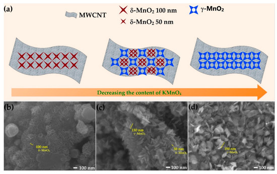 Morphological schema: (a) Schema of changes in morphology of MN-CNT followed by decreasing the content of KMnO4; (b) FESEM image of MN-CNT9010; (c) FESEM image of MN-CNT7525 and (d) FESEM image of MN-CNT6040.