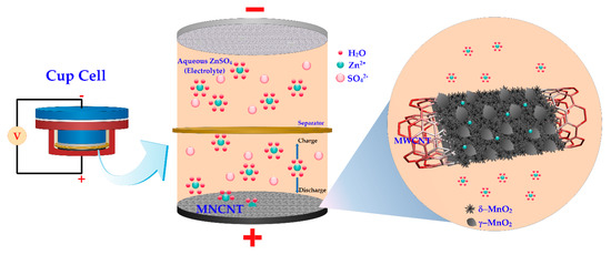 In Figure 3, the battery configuration of the cup cell in this study, which is composed of the MNH-CNT electrode, zinc electrode, and ZnSO4 aqueous electrolyte, is shown. Anodic zinc, dissolved in the form of Zn2+ ions into an aqueous electrolyte containing Zn2+ ions, rapidly solvates in the form of solvated Zn2+ ions during the discharge process. Then, the solvated Zn2+ ions diffuse and pass through the separator to the MN-CNT electrode (cathode). The solvated Zn2+ ions are de-solvated in the form of Zn2+ ions [14,44] and intercalate into MnO2 heterostructure of MN-CNT, as illustrated by the inset in Figure 3. Further, an electron current starts to flow in the electrical loop from the electrical conduction of MWCNTs. These three processes can be reversed when the charging process occurs. Firstly, Zn2+ ions will de-intercalate from the MN-CNT electrode (anode).
