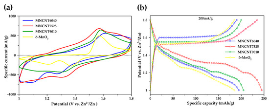 Electrochemical properties: (a) Cyclic voltammograms at a scan rate of 0.5 mV s−1; (b) Galvanostatic charge–discharge profile at 200 mA g−1 of the MN-CNT and δ-MnO2 cathode.