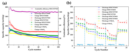 In Figure 5b, rate performances of the δ-MnO2 and MN-CNTs host material cathodes are displayed. Cycling takes place at various specific current densities of 200, 400, 800 and 1600 mA g−1 having five cycles for each rate. The rate performance of MN-CNT7525 was significantly higher than those of δ-MnO2, MN-CNT6040, and MN-CNT9010. The MN-CNT7525 cathode can be charged and discharged at a high rate of 1600 mA g−1, leading to a discharge and charge capacity of 108 and 95 mAh g−1, respectively. It is indicated that the MnO2 heterostructure of MN-CNT with its small nanoscale morphology of δ-MnO2 nanoflower-like and short-length crystal structure of γ-MnO2 provides a faster ion diffusion rate at a high current density. When the current turns back to 200 mA g−1, the MN-CNT7525 cathode can deliver both discharge and charge capacity of 226 and 212 mAh g−1, respectively. It is clear, therefore, that the MnO2 heterostructure of MN-CNT can improve not only cycling stability but also the rate performance for ZIBs. This behavior indicates that the MNH-CNT cathode can well be considered as Zn2+ ion storage material [52].