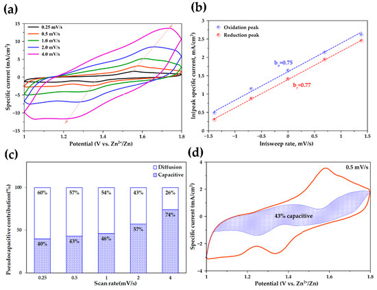 To further investigate the electrochemical storage mechanism of the MN-CNT7525 electrode, CV curves at different scan rates between 0.25 and 4.0 mV s−1 in the voltage range 1.0–1.8 V were recorded and shown, as in Figure 6a. It is seen that one maximum reduction peak and oxidation peak distinctly exist in each cycle, with an increase in specific current exhibited, as scan rates are raised. At much higher scan rates, redox peaks are still maintained at an increased specific current. According to previous studies, the peak current (i) of the CV curves allows a power-law relationship with the scan rate (v) and can be used to analyze the charge storage mechanism, as in Equation (4) [55]: