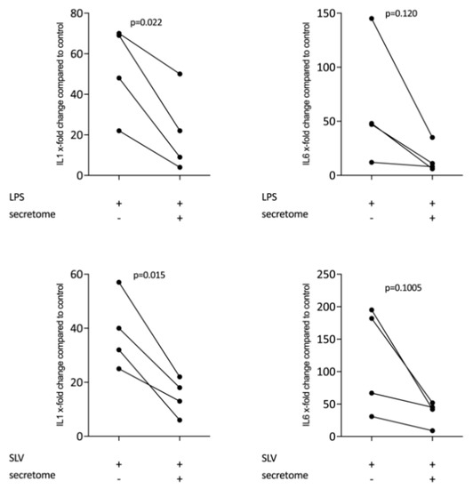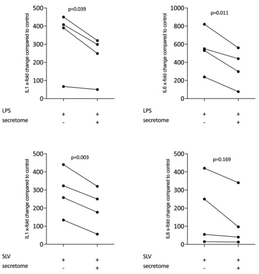 Secretome of irradiated peripheral blood mononuclear cells (PBMCs) suppresses inflammation in primary macrophages. Murine bone marrow-derived macrophages were exposed to secretome corresponding to 1 × 107 irradiated PBMCs/mL. Inflammation was provoked by exposure to LPS 100 ng/mL or 5% Saliva (SLV). X-fold change of expression compared to control is indicated. Dot-blots represent independent experiments. p-values were calculated by paired t-test.