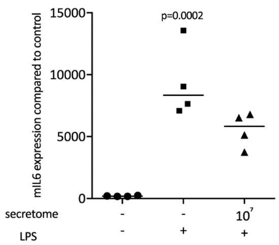 Secretome of irradiated PBMCs suppresses IL6 release in primary macrophages. IL6 protein levels in the supernatant were determined by immunoassay. Murine bone marrow-derived macrophages were exposed to secretome. The inflammation was provoked by LPS 100 ng/mL. Dot-blots represent independent experiments. p-values were calculated by Kruskal–Wallis test.