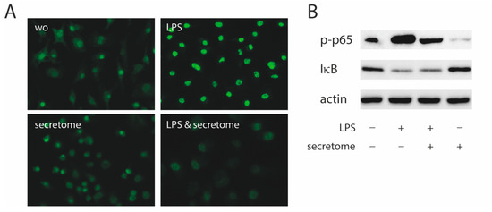 Secretome hampers p65 nuclear translocation and phosphorylation. Murine bone marrow-derived macrophages were exposed to secretome followed by adding LPS for 25 min. (A) The p65 nuclear signal in macrophages being exposed to LPS shows a reduced intensity when combined with the secretome. (B) The secretome reduces LPS-induced phosphorylation of p65 in primary macrophages. Serum-starved murine bone marrow-derived macrophages were exposed to secretome and LPS for 25 min. Targets were detected by antibodies raised against phosphor p65 and IκB.