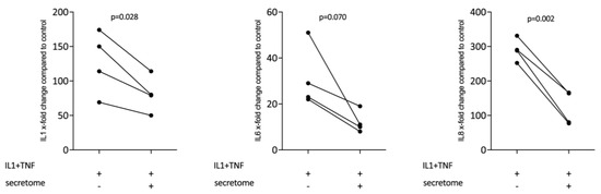 Secretome of irradiated PBMCs suppresses inflammation in primary gingival fibroblasts. Gingival fibroblasts were exposed to secretome corresponding to 1 × 107 irradiated PBMCs/mL. The Inflammation was provoked by IL-1β and TNFα (both at 10 ng/mL). X-fold change of expression compared to control is indicated. Dot-blots represent independent experiments. p-values are based on a paired t-test.