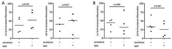 Lipid extracts of irradiated PBMCs suppress inflammation in primary macrophages. Murine bone marrow-derived macrophages were exposed to 1 × 107 secretome and equivalent lipids. Inflammation was induced by exposure to 100 ng/mL LPS (A) or 5% saliva (B). Expression of inflammatory genes is indicated in percentage (%) compared to stimulated controls (100%). Dot-blots represent independent experiments. p-values are based on a Mann–Whitney test.