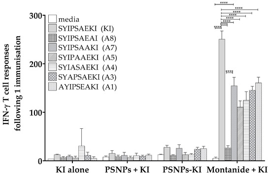 Moderate cross-reactivity to restimulated alanine altered variants of SYIPSAEKI. The 6–8 week old BALB/c mice were immunized once with KI peptide alone (25 µg KI per mouse), PSNPs plus KI or KI conjugated to PSNPs (PSNPs + KI, PSNPs-KI, respectively, 25 µg per mouse KI and 1% solids PSNPs for both groups), or Montanide plus KI (25 µg KI per mouse in 70%/30% v/v Montanide/Phosphate buffered saline (PBS)). Two weeks after the last immunization, splenocytes from immunized mice were harvested and restimulated with altered peptides in an in vitro ELISpot assay for IFN-γ. Data shown as mean +/- SD of spot forming units (SFU)/million cells per assay triplicates (pooled cells from 3–4 mice per group). * p < 0.05, ** p < 0.01, *** p < 0.001, **** p < 0.0001.