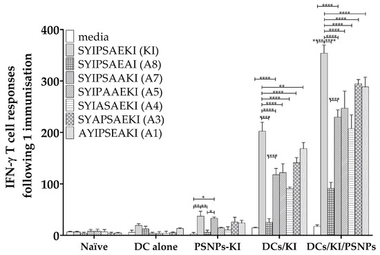 Differential response to alanine screened altered variants of SYIPSAEKI when conjugated to PSNPs or pulsed with DCs. The 6–8 week old BALB/c mice were immunized once with PBS alone, DCs alone (1 × 106 DCs per mouse), KI conjugated to PSNPs (PSNPs-KI, 25 µg per mouse KI and 1% solids PSNPs), ex vivo KI pulsed DCs (DCs/KI, DCs pulsed with 5 µg/mL KI and 1 × 106 cells immunized per mouse), or ex vivo KI pulsed DCs coinjected with mixed in PSNPs (DCs/KI/PSNPs, 1 × 106 cells injected with 0.67% PSNPs). Five weeks after the last immunization, splenocytes from immunized mice were harvested and restimulated with alanine altered peptides in an in vitro ELISpot assay for IFN-γ. Data shown as mean +/- SD of SFU/million cells per assay triplicates (pooled cells from four mice per group). * p < 0.05, ** p < 0.01, *** p < 0.001, **** p < 0.0001.