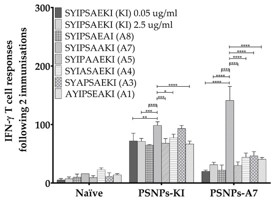 No evidence of antagonistic responses for KI restimulated together with alanine altered peptide variants in vitro. The 6–8 week old BALB/c mice were immunized twice with PBS alone or KI or A7 conjugated to PSNPs (25 µg per mouse KI and 0.72–0.92% solids PSNPs for both groups). Thirteen days after the last immunization, splenocytes from immunized mice were harvested and restimulated with KI for one hour followed by addition of each alanine altered peptide for another ~16 hours in an in vitro ELISpot assay for IFN-γ. Data shown as mean +/− SD of SFU/million cells per assay triplicates (pooled cells from four mice per group). * p < 0.05, ** p < 0.01, *** p < 0.001, **** p < 0.0001.