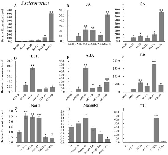 The expression profile of GmbZIP19 in response to biotic and abiotic stresses. (A–I) The expression profile of GmbZIP19 in response to S. sclerotiorum, 100 μM JA (jasmonic acid), 1 mM SA (salicylic acid), 100 μM ABA (abscisic acid), 1 mM ETH (ethephon), 100 μM BR (brassinolide), 100 mM NaCl for salt condition, 250 mM Mannitol for drought condition and 4 °C for low temperature. Three technical replicates were performed for each of the three independent biological replicates. The error bars were obtained from multiple replicates of the RT-qPCR and indicate ±SD (n = 3 replicates). Asterisks indicate significant differences for the indicated comparisons based on a Student’s t-test (** p < 0.01; * p < 0.05).