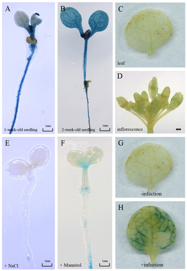 In order to verify the expression pattern of GmbZIP19, we generated pGmbZIP19-GUS fusion transgenic Arabidopsis plants (pGmbZIP19-GUS). GUS staining was detected in the shoot apical meristem (SAM), hypocotyl and root of one-week-old pGmbZIP19-GUS seedlings (Figure 2A). A similar GUS expression pattern was also examined in two-week-old pGmbZIP19-GUS seedlings (Figure 2B) but no GUS signal was found in mature pGmbZIP19-GUS plants, including in the leaves and inflorescence (Figure 2C,D). Interestingly, the pGmbZIP19-GUS signal was significantly reduced when one-week-old pGmbZIP19-GUS seedlings were treated with 150 mM NaCl or 300 mM mannitol for 7 days (Figure 2E,F), suggesting that the expression of GmbZIP19 was inhibited by salt and drought. These results were consistent with the reduced expression of GmbZIP19 evaluated by RT-qPCR after salt and drought (mimic using mannitol) treatment after 24 h (Figure 1), which indicated that GmbZIP19 may be involved in regulating different abiotic stress tolerance.