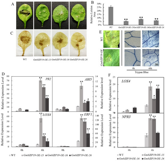 Furthermore, we investigated whether GmbZIP19-OE in Arabidopsis can also enhance plant tolerance to Pseudomonas syringae (pst DC3000), a (hemi) biotrophic bacterial pathogen that can cause bacterial leaf spot disease [24]. After 48 h of Pseudomonas syringae infection, WT plants exhibited extremely severe chlorosis symptoms showing large disease spots and a strong trypan blue staining signal, representing the large number of dead cells, in the whole leaf. Nevertheless, the leaves of GmbZIP19-OE lines had smaller disease spots and a lighter trypan blue staining signal after Pseudomonas syringae inoculation (Figure 3E). The result demonstrated that GmbZIP19 promotes plant tolerance to Pseudomonas syringae as well. Moreover, the increased transcription levels of JA-related gene, AtLOX4, and SA-related gene, AtNPR3, confirmed the phenotype and suggested that JA- and SA-dependent genes are involved in the regulation of GmbZIP19 to pst. DC3000 (Figure 3F).