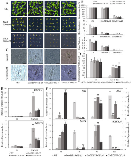 With the treatment of 150 mM NaCl, the majority of stomata of WT leaves were completely closed, while the stomata of the GmbZIP19-OE lines did not close completely (Figure 4C). The stomatal aperture (width/length) of GmbZIP19-OE was extremely higher than that in WT under salt treatment, while there was nearly no difference under the control condition (Figure 4D). The expression levels of WRKY54 and WRKY70, two marker genes negatively regulating the stomatal closure [25], increased significantly in GmbZIP19-OE lines compared with that in WT under 150 mM NaCl treatment, while the expression levels of these two genes showed no significant difference in GmbZIP19-OE lines and WT under control also confirmed that the stomata of GmbZIP19-OE plants was defected. The defective stomatal aperture may be associated with the reduced tolerance of GmbZIP19-OE plants to salt.