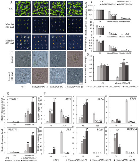 To further analyze the functions of GmbZIP19 in plant response to osmotic stress, WT and three GmbZIP19-OE Arabidopsis lines were subjected to 0, 300 and 400 mM mannitol. WT and GmbZIP19-OE plants have no significant difference in germination rate root length and fresh weight when grown in half strength MS medium without mannitol (Figure 5A,B). However, when subjected to drought stress with 300 and 400 mM mannitol, a considerable reduction in seed germination, root length and fresh weight were observed in both GmbZIP19-OE and WT plants, and the reduction rate was more severe in GmbZIP19-OE lines than WT (Figure 5A,B). These results suggested that overexpression of GmbZIP19 in Arabidopsis reduced plant drought tolerance. The reduced drought tolerance in GmbZIP19-OE plants was associated with defects in stomatal closure (Figure 5C–E), suggesting that stomatal closure may contribute to resistance to drought.