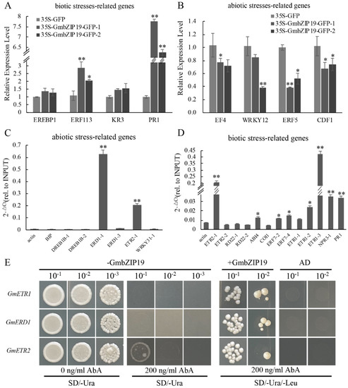The ChIP result of 35S-GmbZIP19–GFP transient expressing soybean. (A) qRT-PCR analysis of biotic stress-related genes in 35S-GmbZIP19–GFP transient expressing soybean. (B) qRT-PCR analysis of abiotic stress-related genes in 35S-GmbZIP19–GFP transient expressing soybean. (C) ChIP-qPCR analysis of GmbZIP19 binding to abiotic stress-related genes using GFP antibody and 35S-GmbZIP19–GFP transient expressing soybean. (D) ChIP-qPCR analysis of GmbZIP19 binding to biotic stress-related genes using GFP antibody and 35S-GmbZIP19–GFP transient expressing soybean. Three independent biological replicates were performed. The error bars indicate ± SD (n = 3 replicates). Asterisks indicate significant differences for the indicated comparisons based on a Student’s t-test (** p < 0.01; * p < 0.05). (E) The yeast one-hybrid result of GmbZIP19. Three independent biological replicates were performed.