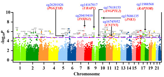 Manhattan plot of the promoter-wide methylation association in gout. X-axis shows chromosomal positions. Y-axis shows minus log10P of differential methylation tests for probed CpG sites. The dashed line indicates the false discovery rate significance threshold of 0.05. The 66 CpG sites passing multiple corrections are labeled with corresponding gene names. CpGs retained in the final analysis (cg26201826, cg20419410, cg17618153, cg15686135, cg14167017, cg11988568, and cg16745952) and corresponding genes (PGGT1B, INSIG1, ANGPTL2, JNK1, UBAP1, RAPTOR, and CNTN5) are highlighted with blue and red, respectively. The associations between CpG methylation and gout are calculated with multiple regression, correcting for sex, age, smoking history (total pack-years), smoking status, alcohol consumption, and blood cell subsets.