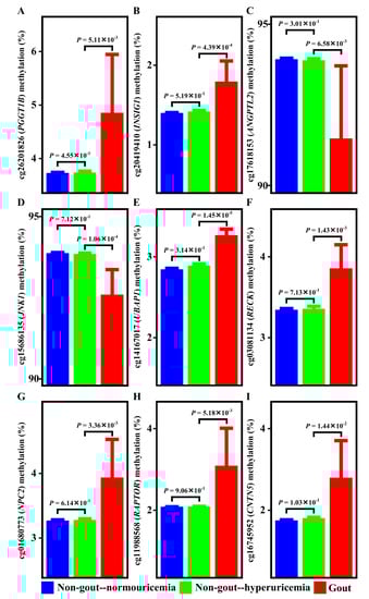 Gout progresses through two steps: hyperuricemia and gouty inflammation [3,4,5,6]. To clarify whether these CpG methylation sites are associated with gout through hyperuricemia or gouty inflammation, we examined the methylation of CpG sites in normouricemia, hyperuricemia, and gout (Figure S1, Step 2d). As shown in Figure 2, as patients transited from normouricemia to hyperuricemia, the methylation of PGGT1B (Figure 2A), INSIG1 (Figure 2B), ANGPTL2 (Figure 2C), JNK1 (Figure 2D), UBAP1 (Figure 2E), RECK (Figure 2F), NPC2 (Figure 2G), RAPTOR (Figure 2H), and CNTN5 (Figure 2I) remained the same. However, when patients transited from hyperuricemia to gout, methylation of PGGT1B, INSIG1, ANGPTL2, JNK1, UBAP1, RECK, NPC2, RAPTOR, and CNTN5 changed (Figure 2A–I). Methylation alterations occurred in the transition from hyperuricemia to gout. These suggested that epigenetic associations of PGGT1B, INSIG1, ANGPTL2, JNK1, UBAP1, RECK, NPC2, RAPTOR, and CNTN5 with gout came from the gouty inflammation step rather than the hyperuricemia step. This was further supported by a literature review demonstrating no overlap between these nine loci and previously identified uric acid-associated loci (Table S3; Figure S1, Step 2e).
