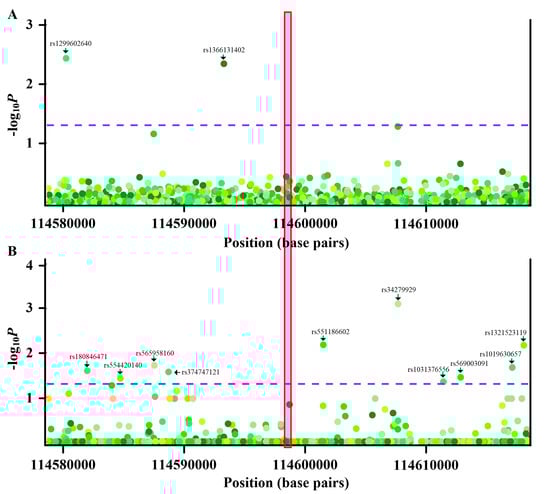 As shown in Figure 3, although some nearby variants were associated with PGGT1B methylation (Figure 3A) or gout (Figure 3B), no variants were concurrently associated with PGGT1B methylation and gout. Thus, a common variant did not underlie the observed epigenetic associations between PGGT1B methylation and gout. Similar conclusions were obtained regarding INSIG1, ANGPTL2, JNK1, and CNTN5 (Figures S5–S7 and S10). Two variants (rs1189081296 and rs962251804) were simultaneously associated with UBAP1 methylation and gout (Figure S8A,B). Causal inference testes showed that UBAP1 methylation mediated relationships between variants (rs1189081296 and rs962251804) and gout (Figure S8C). Likewise, while rs754012543 was associated with RAPTOR methylation and gout (Figure S9A,B), a causal inference test revealed that RAPTOR methylation was the mediator between rs754012543 and gout (Figure S9C). Regarding RECK and NPC2, rs186201319 and rs539604468 confounded the relationship between RECK methylation and gout and between NPC2 methylation and gout, respectively (Table 1, Table S4). Taken together, these results suggested that relationships between PGGT1B, INSIG1, ANGPTL2, JNK1, UBAP1, RAPTOR, and CNTN5 methylation and gout were not confounded by genetic mediators. Therefore, these seven CpG sites located in seven genes (PGGT1B, INSIG1, ANGPTL2, JNK1, UBAP1, RAPTOR, and CNTN5) were reserved for the following analysis.