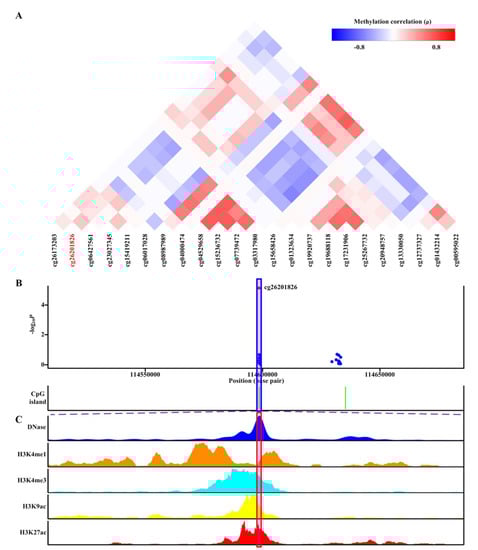 Co-methylation analysis and functional localization of cg26201826 (PGGT1B). (A) Patterns of co-methylation at the CpG sites surrounding cg26201826. (B) Regional association results along with position of nearby CpG islands (green). cg26201826 (highlighted in shaded box) is located in CpG islands. (C) Functional annotation of cg26201826. DNase hypersensitive sites derived by DNase-seq (DNase Track) and histone marks surrounding cg26201826 (H3K4me1, H3K4me3, H3K9ac, and H3K27ac tracks) in monocytes are shown. DNase hypersensitivity, H3K4me1, H3K4me3, H3K9ac, and H3K27ac histone marks are associated with active regulatory elements.