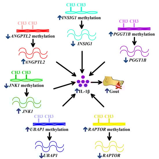 Potential mechanisms underlying associations of PGGT1B, INSIG1, ANGPTL2, JNK1, UBAP1, and RAPTOR methylation with gouty inflammation. PGGT1B hypermethylation in gout decreases PGGT1B, INSIG1 hypermethylation in gout reduces INSIG1, ANGPTL2 hypomethylation enhances ANGPTL2, hypomethylated JNK1 increases JNK1, UBAP1 hypermethylation downregulates UBAP1, and hypermethylated RAPTOR represses RAPTOR. All of these culminate in augmented IL-1β production, facilitating gouty inflammation. The blue arrows mean the change of methylation or expression or development of gout. The black arrows mean the consequence of methylation or expression alterations.