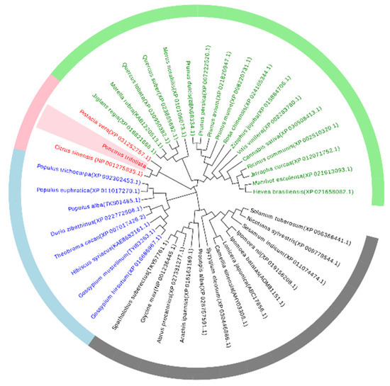 Six-month-old trifoliate orange (Poncirus trifoliate) seedlings in this assay were planted in a green house. All tobacco (Nicotiana benthamiana) seedlings were grown in a plant growth chamber with 16 h light/8 h dark cycle at 28 °C.