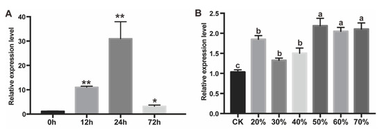 Expression patterns of PtAOS1 in response to jasmonic acid (JA) (A); and drought (B). Data are shown as mean ± SD of three replicates. CK, control samples under well-watered condition. Asterisks indicate significant differences between treatment and control (*, p < 0.05 and **, p < 0.01). Different letters above the columns indicate significant differences at p < 0.05.